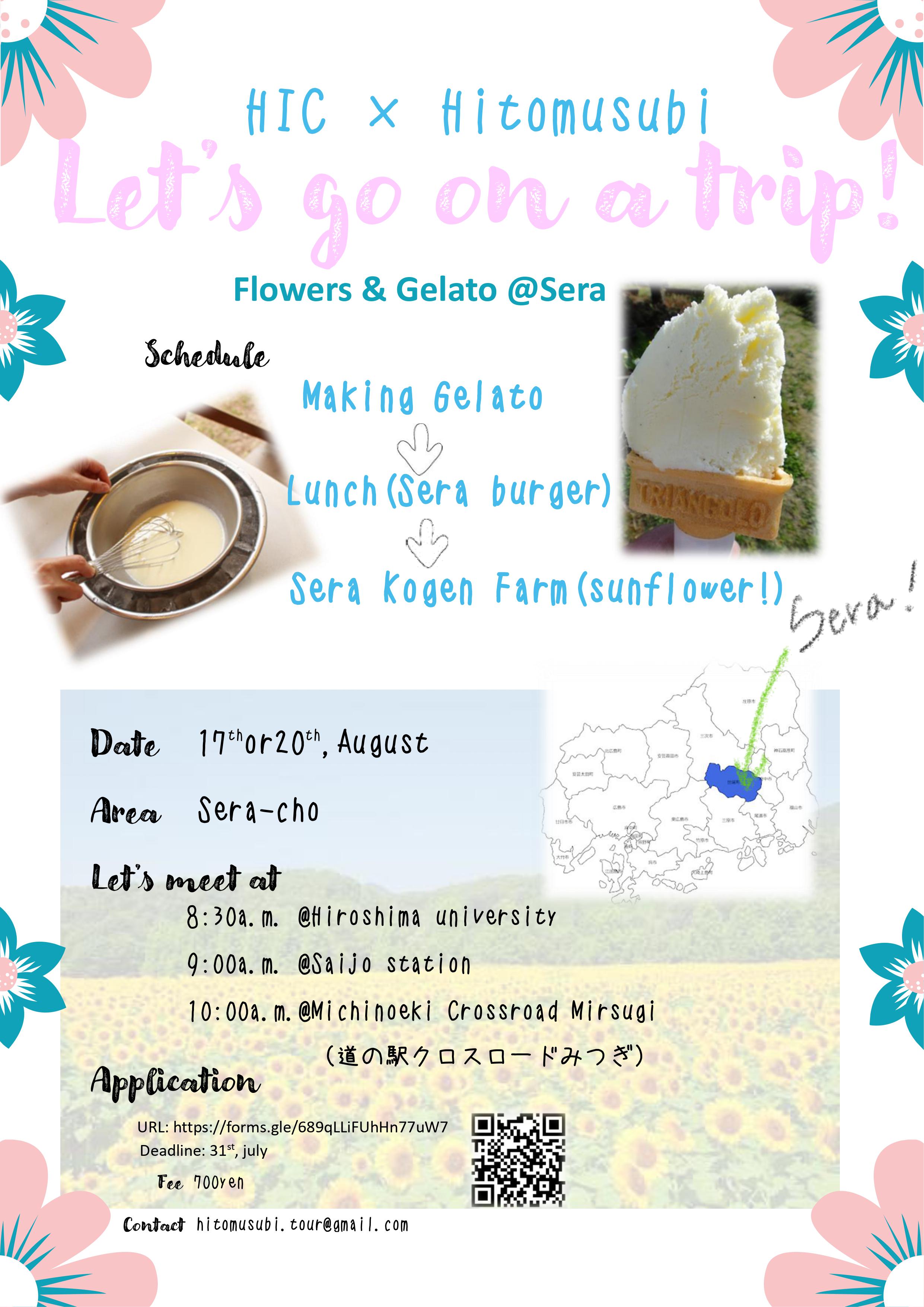 We at the Hiroshima International Center will have "International Exchange Event in Sera " in cooperation with Hitomusubi Inc. Why don’t we make gelato and enjoy in a field full of sunflowers?